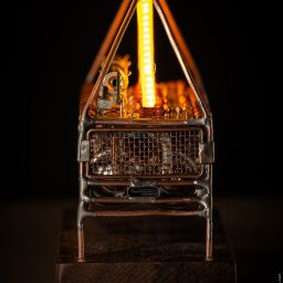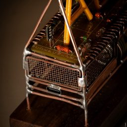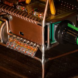 Скульптура сделана из медного провода 1.5мм — для каркаса, 1мм — для внутренних деталей, 0.8мм — для электрических соединений. Также использовал медную сетку и пластины. Подставка – орех.