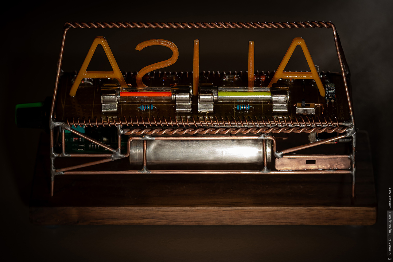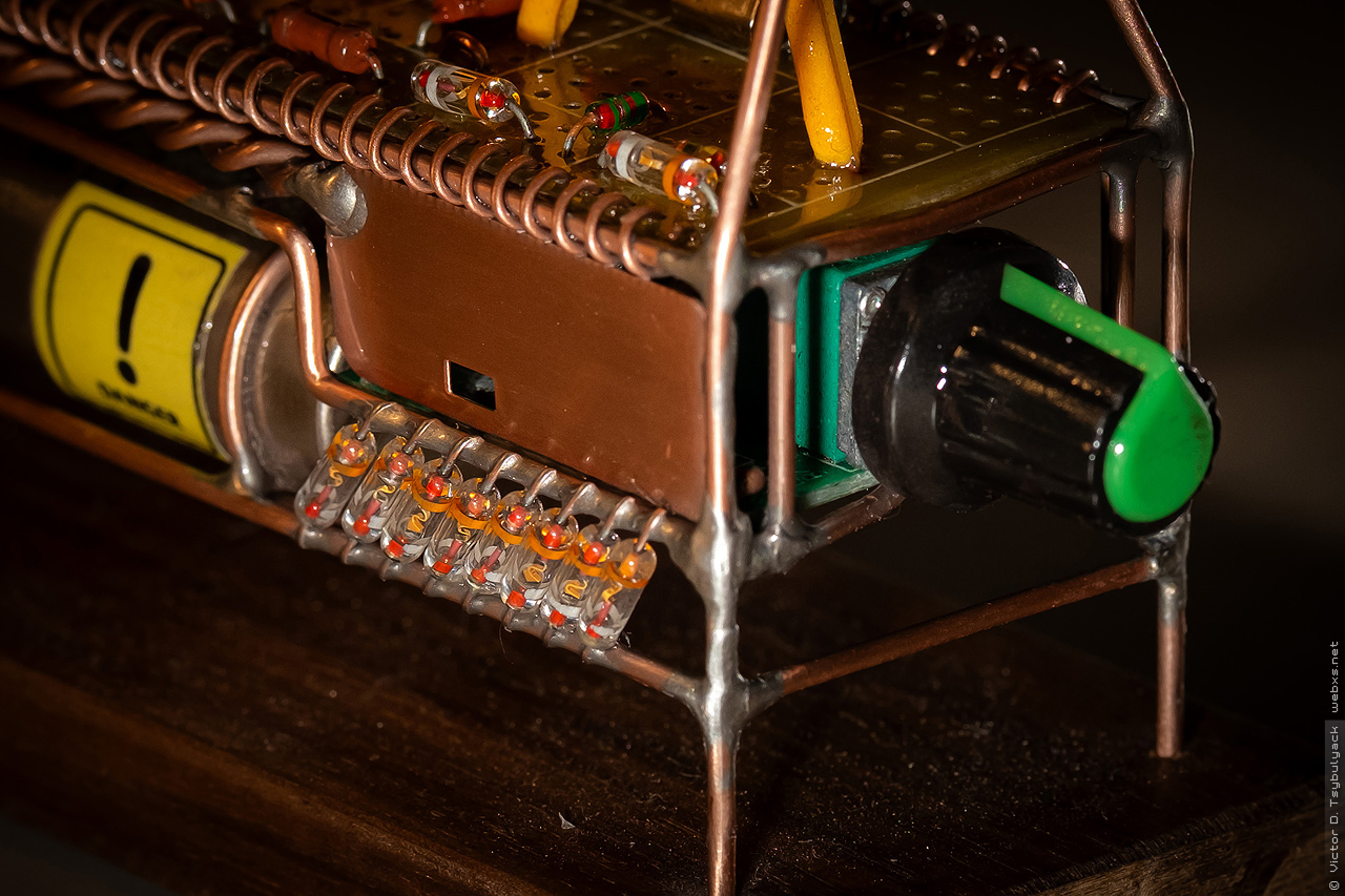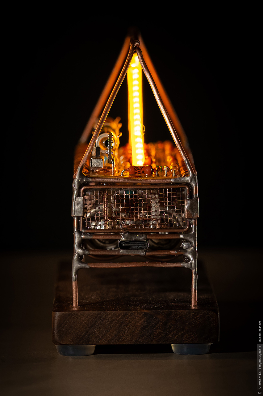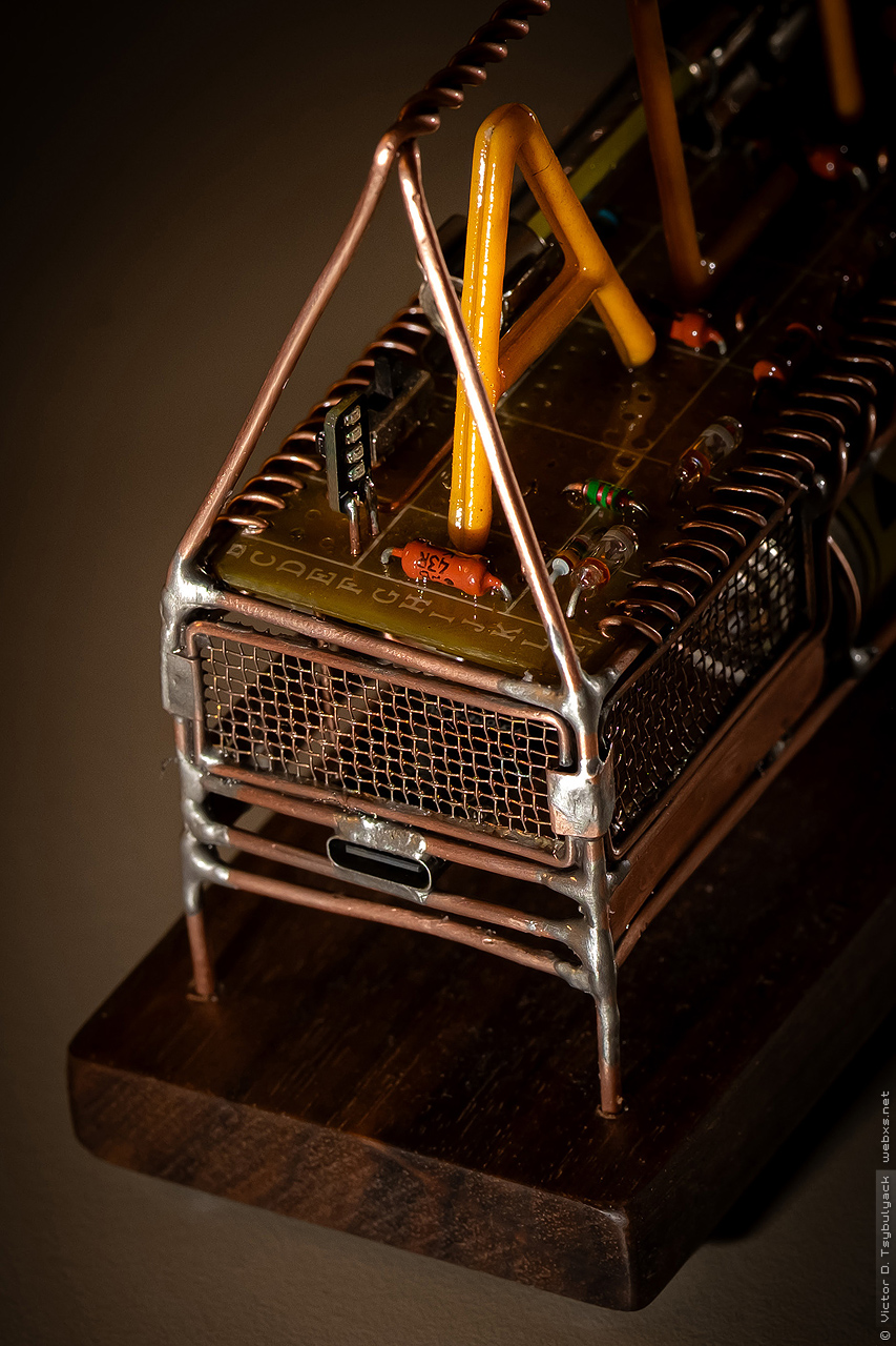 Скульптура сделана из медного провода 1.5мм — для каркаса, 1мм — для внутренних деталей, 0.8мм — для электрических соединений. Также использовал медную сетку и пластины. Подставка – орех.