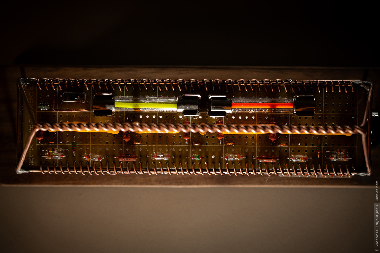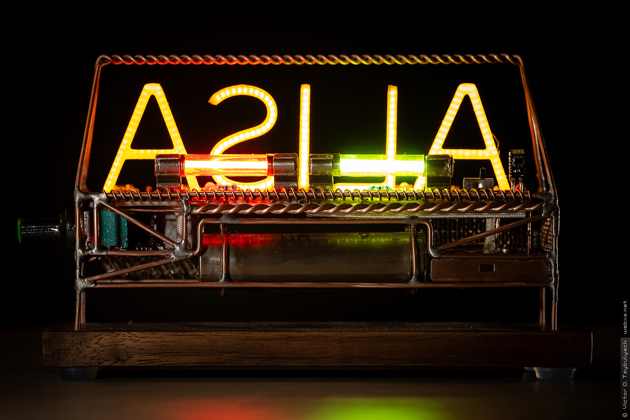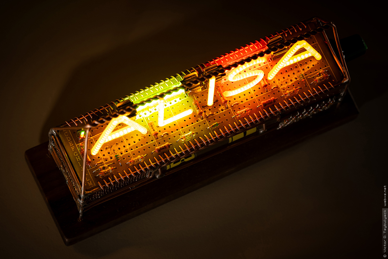 Яркость букв регулируется ШИМ-контроллером для двигателей, и ограничены обычными резисторами подобранными чтобы ограничить по разному ток, ибо количество мелких диодных кристаллов разные в разных буквах и яркость получалась разная. Буквы влючаются отдельно от индикатора с цветными светодиодами на фоне.